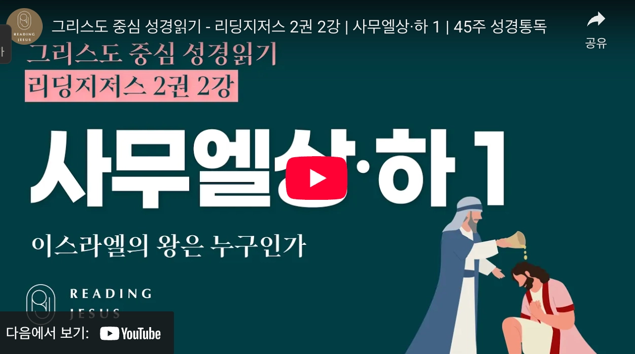 사무엘상하 그리스도 중심 읽기 강의 영상 필수 시청. 매 영상이 그렇지만, 영상이 참 좋습니다. 성경을 그리스도 중심으로 바르게 읽는 시각을 줍니다.
