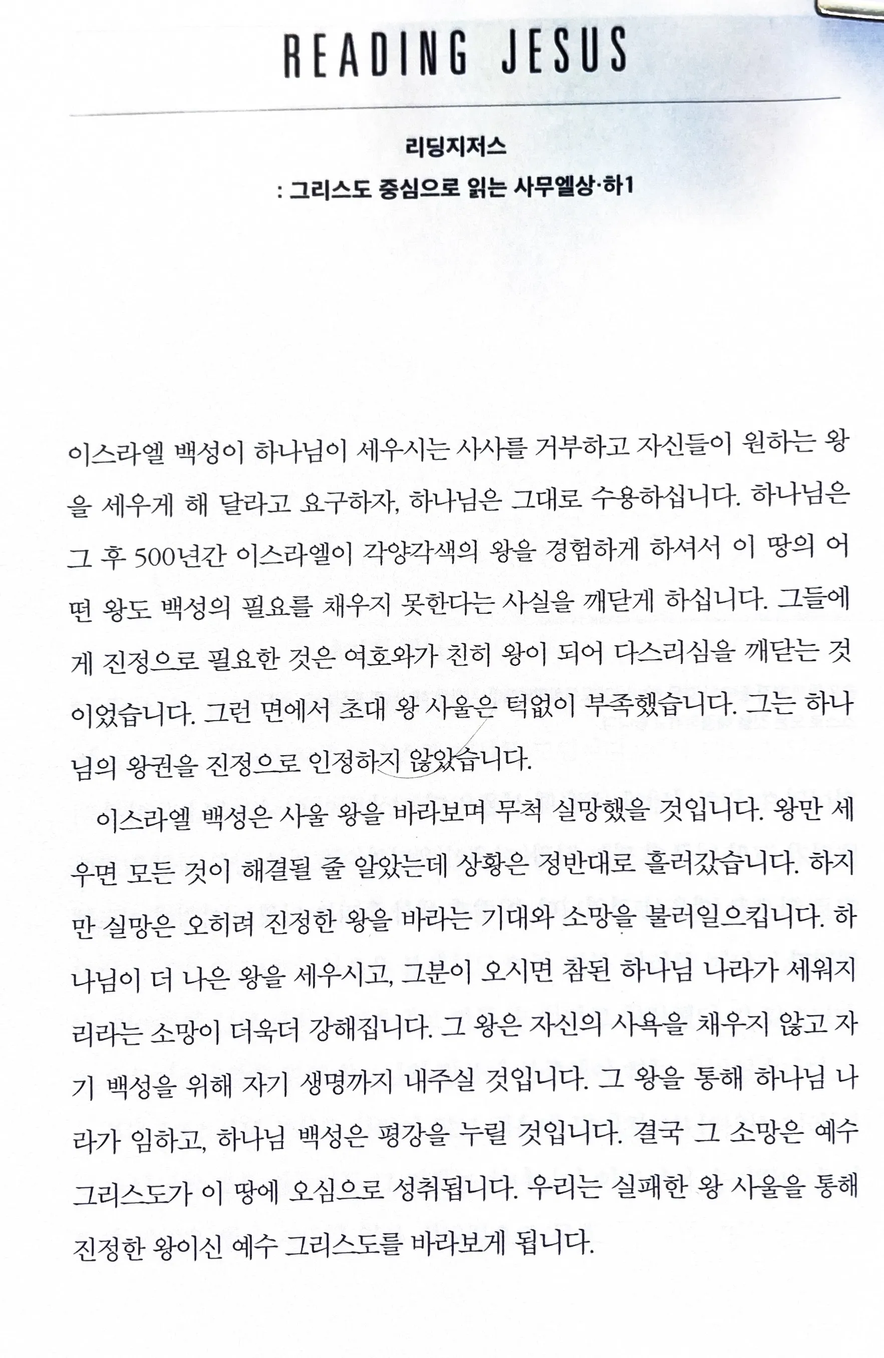 앞으로 전개되는 스토리속에 인간이 세운 왕이 교만과 자신의 악으로 어떻게 무너져 가는지, 그와 대조적으로 하나님의 마음에 합한 하나님이 세우시는 왕의 부상을 보게 될 것입니다.